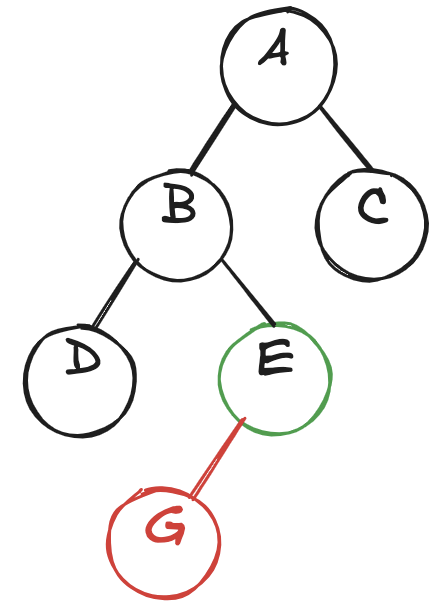 A leaf of a tree has no children (Ex: <C>, <E>, and <F>)