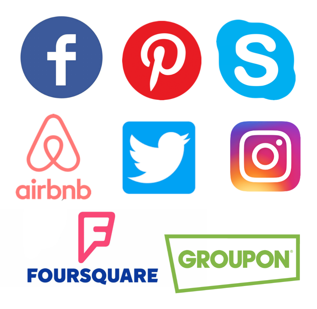 Skype, Facebook, Instagram, Twitter, Foursquare, Pinterest, Airbnb, Fab, Groupon, and Zynga 등등